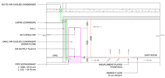 Based on this high sensible heat rate, wisely, the ASHRAE 90.1-2019 Standard uses the Net Sensible Coefficient Of Performance (NetSCOP) index as a basis for the user to compare the efficiency of the air conditioning machine with a minimum of efficiency specified in the standard. This condition is important because, in some medium data centers, standard equipment (self-contained air conditioning) can be used, and split-type air conditioning system may be used in some smaller data centers [8]. Different from common equipment, the CRAC is designed specifically for data centers. The project type of downflow air supply is used often, and CRAC has the appearance of a closet, designed for a high sensible heat rate, providing more reliability. Figure 3 shows a sectional view of CRAC equipment installed in a data center, and Figure 4 shows a plan view of CRAC installation within a downflow safe room.