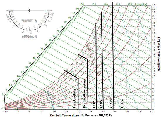 From a macro point of view, there is an index that analyzes the conditions of free cooling, evaporative system, and variable COP in data centers: the Energy Usage Effectiveness Design (EUED), with the following characteristics (see Figure 5) [13]: