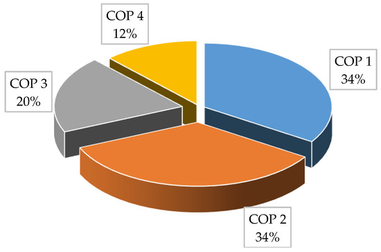 Using part of the IPLV formula, EUED, and AHRI 13621 concepts, Equation (2) was determined using percentages of COPs shown in Figure 7 [16].