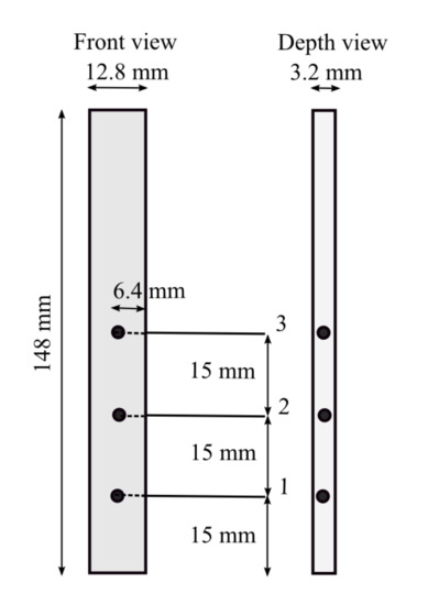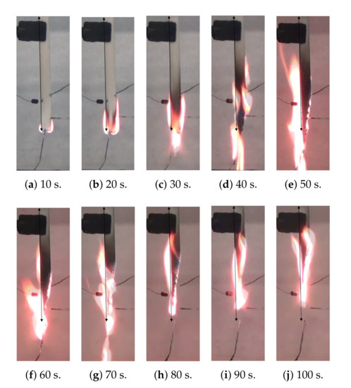The UL 94 test [33] was performed in a burning chamber (UL 94, FTT, UK) Technology, United Kingdom). The dimensions of the specimens were 127 × 12.7 × 3.2 mm, and each of them was equipped with three type-K thermocouples (Inconel 600, diam. 0.75 mm, long. 250 mm, Tmax = 800 C) located in different sections of the specimens (Figure 3). The flame was inflicted at the bottom of the specimen for 10 s. Once this time passed, the flame was taken out, and the fire did not stop spreading along the sample, as shows in Figure 4. As a consequence of this behavior during the test, the material was classified as “no rating” according to [5].