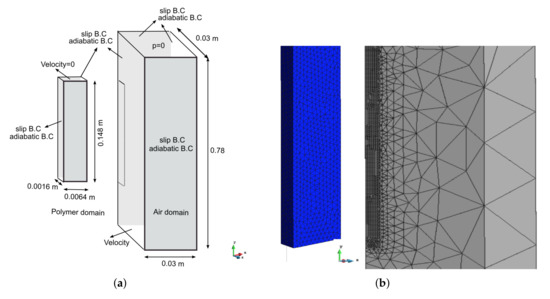 Problem definition. (a) Computational domains with boundary conditions. (b) Meshes of the polymer and the air.