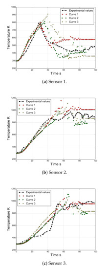 Subsequently, the remaining curve represents the measurements of the temperature corresponding to the flame or melted material passing through the thermocouples. It is important to remark that all of the thermocouples for an unknown reason move away from their original positions. Note that this is evident for thermocouple 1, where the recorded temperatures decrease. In order to consider this effect, an approximated trajectory was taken from the images. Although this procedure is limited by the quality of images, the numerical results corresponding to the trajectory of the thermocouples follow the same trend as that observed in the experimental results. In particular, the results corresponding to curve 2 are those that best fit the experimental results.