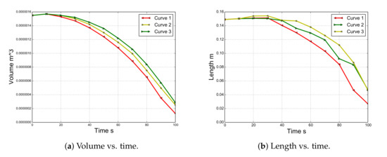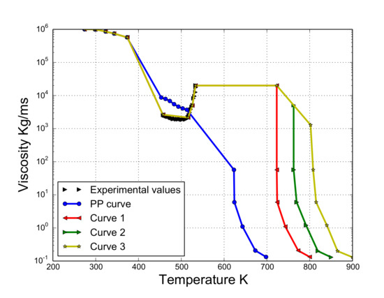 As viscosity is the key parameter for modeling the dripping behavior [6,7], in this work, it was estimated on the basis of the viscosity curve provided by NIST [12] and the images of the experiment for those ranges where the curve was not available. These two sources allowed us to estimate the viscosity–temperature curve as follows: (i) if temperature < 453.15 K, viscosity is directly approximated using the NIST curve [12]; (ii) if temperature > 533.15 K and temperature < 724 K, viscosity is set to 20,000 [m/s] (last known value of the rheological study) since the polymer does not considerably move according to the experiment ); (iii) if temperatures > 725 K, three ways to decrease the viscosity are proposed following the pattern showed by the NIST curve. It should be noted that these curves are from hereon referred to as curve 1, curve 2, and curve 3. These are presented in the Appendix A and plotted in Figure 7. Figure 7 also shows the viscosity–temperature dependency of the pure PP in [12].