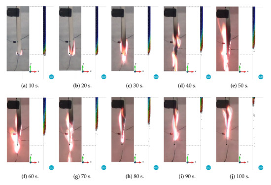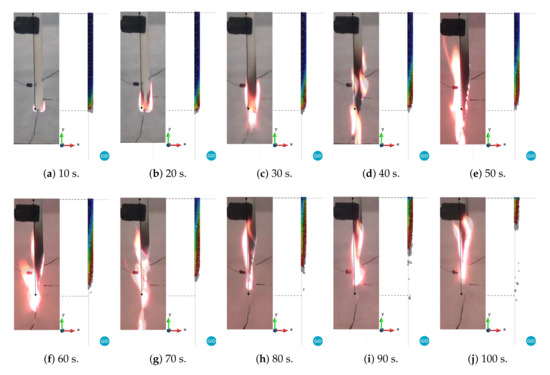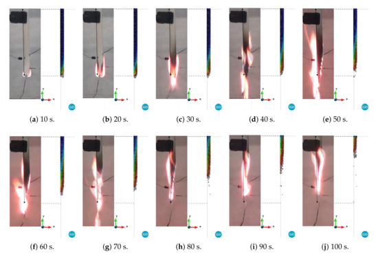 A quick inspection of the figures reveals good agreement in the shapes between the experimental and numerical results for all of the curves up to 20 s. This is due to the fact that the three cases have the same viscosity until 723.15 K. As time progresses, the difference between the three cases becomes more evident. For instance, case 1 begins to reduce its volume due to melting and dripping before the experiment does. On the other hand, case 3 shows behavior dominated more by melting than by dripping. In fact, the length and width of the model are larger than those of the experimental model until 60 s (Figure 11b). Finally, case 2, whose curve is between case 1 and 3, shows better agreement with the experimental results in terms of shapes of the specimen than that of the other cases. However, none of these cases is able to capture the thread of molten material that appears after 70 s. This behavior is probably linked to the surface tension effects, which are not considered in this work. Moreover, a higher temperature at the edges due to the edge effect was observed [36,37]. In addition, according to Figure 8, Figure 9 and Figure 10, the sample did not stop the fire from spreading as in the case of the UL 94 test.