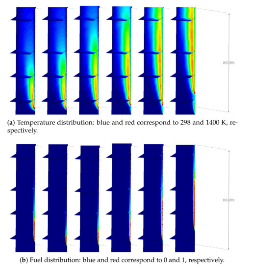 The results shown in Figure 12a present the computed temperature distribution across four horizontal cut planes at different heights of the air domain for curve 2. As time progresses, the heat zone develops in the air domain, providing heat feedback to the specimen. As a consequence, thee temperature in the polymer evolves, leading to a reduction in the viscosity value corresponding to curve 2. Due to this viscosity change, the polymer starts to melt and drip. The aforementioned phenomena together with the gasification are responsible for the volume reduction in the sample. As can be observed in Figure 12b, the maximum concentration of fuel appears in the polymer–air interface when the polymer reaches the gasification temperature due surface exposure to a heat flux. Finally, this fuel mixes with the oxygen and reacts, thereby producing the combustion.