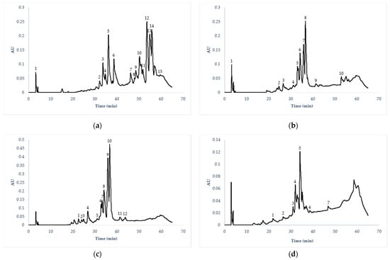 Chromatographic profiles of the main phenolic compounds of cactus flowers from Hidalgo, Mexico. (a) Cylindropuntia rosea (CA): (1, 10, 15) hydroxycinnamic acids, (5) anthocyanins, (2, 3, 4, 6, 12) flavonols, (7, 11, 14) hydroxybenzoic acids, (13) methoxyflavones, (9) proanthocyanidin trimers. (b) Opuntia oligacantha (XU): (1, 2, 3) methoxycinnamic acids, (4, 10) methoxyflavones, (6) flavonols, (7, 8) methoxyflavonols. (c) Opuntia matudae (XC): (1, 2) methoxycinnamic acids, (4) lignans, (5) methoxyflavones, (8) flavonols, (9, 10) methoxyflavonols, (12) anthocyanins. (d) Echinocereus cinerascens (PI): (1, 2) catechins, (3, 4, 5) flavanols, (7) methoxyflavonols.