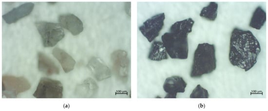 From the observations of microscope images of each particle size fraction of coal and rock, the particles appeared to have a similar angular shape, as is evident from the microscope images of the crushed materials between 150 and 212 μm in Figure 1.