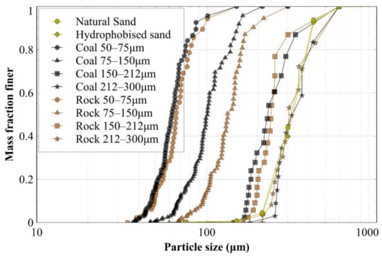 To construct the GSD for each material, the open-source image analysis software ImageJ was used, which provided the maximum and minimum Feret diameter of each particle in an image. Each particle was then simplified to a sphere, with the diameter equal to the average of the two Feret diameters. Note that the accuracy of the PSD constructed with this method was limited by a lack of information in the third dimension. Nevertheless, each particle in the microscope images had an associated volume and diameter, allowing the size distributions to be determined. The resulting PSDs are shown in Figure 2, which shows that the PSDs of the crushed rock and crushed coal were relatively consistent for all but one size fraction. Only the 75–150 μm fraction displayed a small difference between rock and coal, which was still deemed acceptable given the lack of control of particles between two consecutive sieves.