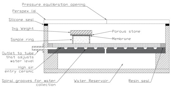 The drying path of the water retention curve was obtained from a hanging column (also called a negative water column) [21] which had a porous ceramic 30 cm in diameter with an air entry suction of 50 kPa. Pressure was induced in the water reservoir beneath the stone by adjusting the level of a clear, flexible tube (water column) attached to the reservoir at an outlet just below the plate. Suction was induced in the reservoir when the water level of the tube was below the porous ceramic, as this placed the water into tension. Figure 3 shows a diagram of the apparatus used.