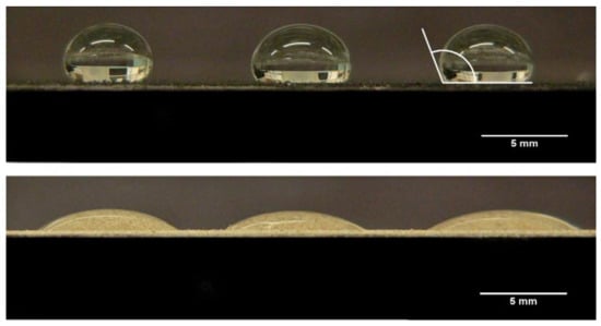 The CAs measured for all the materials used in this study are shown in Table 2, and example images of the water droplets used in creating Table 2 are presented in Figure 4.