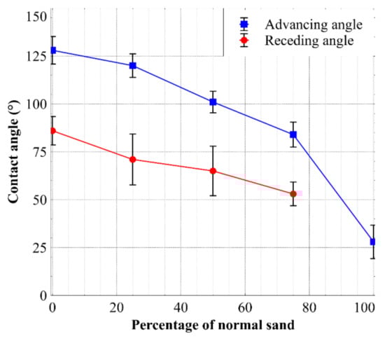 Advancing and receding angles measured for the sand and sand mixtures.