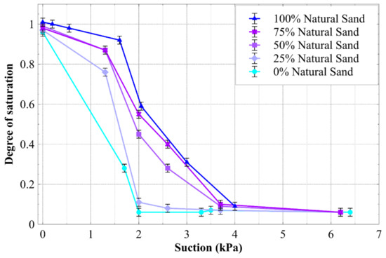 The WRCs of the natural sand and sand mixtures determined from inducing suction with a hanging column are presented in Figure 6, expressed in terms of the degree of saturation. The data in Figure 6 indicates that the natural sand and the sand mixtures all desaturated at low suctions (<1 kPa), and a reduction of the natural sand content (or an increase in the average CA) caused the degree of saturation at any suction to reduce. This observation is consistent with similar water retention curves for hydrophobic materials, which were expressed in terms of the gravimetric water content vs. suction [11].