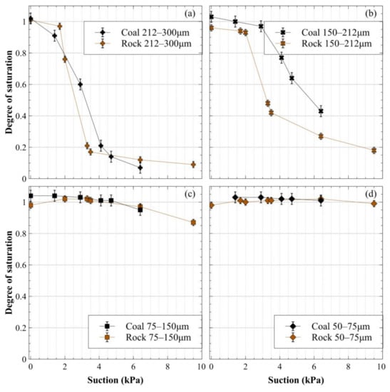 Drying path of the water retention curves of crushed coal and crushed rock expressed as the saturation degree vs. suction: (a) 212–300-μm size fraction; (b) 150–212-μm size fraction; (c) 75–150-μm size fraction and (d) 50–75-μm size fraction.