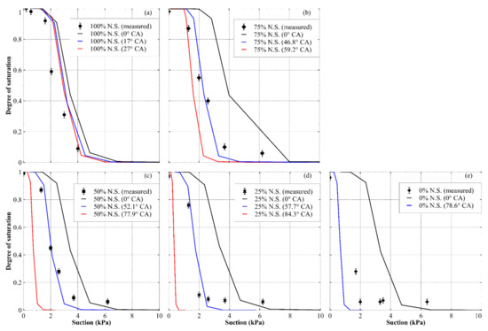 Predicted drying path of WRCs for sand and sand mixtures at different contact angles, expressed in terms of the degree of saturation vs. suction for (a) natural sand, (b) 75% natural sand and 25% hydrophobized sand, (c) 50% natural sand and 50% hydrophobized sand, (d) 25% natural sand and 75% hydrophobized sand and (e) 0% natural sand and 100% hydrophobized sand. For each prediction, CA values of 0 (black lines), CAmean − CASD (blue lines) and CAmean + CASD (red lines) were used. N.S. denotes natural sand.