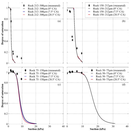 Similar to what was done for the sand mixtures in Figure 10, the predicted drying paths of the WRCs are shown for the rock in Figure 11. It can be seen that there was little difference between the WRCs predicted using the larger and smaller values of a receding CA and the WRC prediction at a CA of zero, which highlights how assuming a CA of zero may be reasonable for hydrophilic materials. The predicted WRCs for the 212–300 μm fraction of crushed rock were a good approximation to the measured data, with the accuracy reducing near the residual water content (near degree of saturation of 0.1). The predictions for the 150–212 μm fraction were also similar to the experimental data, though they were not as close as the 212–300 μm fraction. For the two smallest rock fractions, the accuracy of the predicted WRCs was uncertain due to a lack of data beyond 10 kPa of suction (because of cavitation of the hanging column at higher suctions).