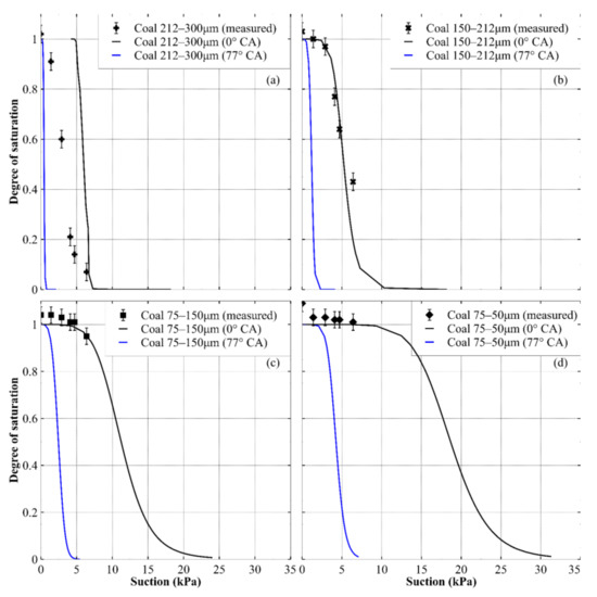 The predicted drying paths of the WRCs of the crushed coal are presented in Figure 12, which shows that the predictions using the measured receding CA values were not useful for any size fraction. A reasonable prediction for the coarsest fraction may be possible with a contact angle somewhere between 0° and 77°, but this would be a trial-and-error fit with no obvious basis for selecting a particular value. The prediction using a CA of zero appeared to give a good approximation for the 150–212 μm fraction. Similar to the results for the crushed rock, the prediction accuracy of the zero CA prediction for the two smallest coal fractions was uncertain due to a lack of data beyond 10 kPa of suction; however, for the small range available, the fit was reasonable.