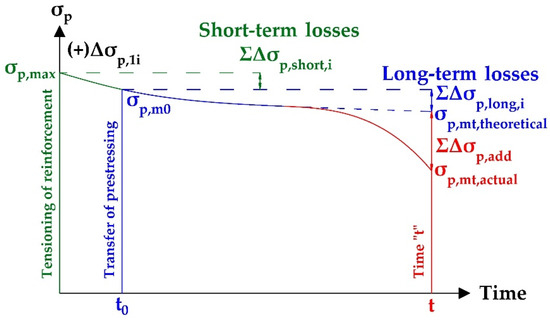 In general, the value of prestress losses is less than 25% of the initial prestressing force, while the reported average value based on the results of more than forty studies is 21% [3]. The design of prestressed concrete structures always respects used prestressing technology as it influences the evaluation of prestressing force value over time. Prestress losses that immediately affect the level of prestressing fall into the group of short-term losses (ΣΔσp,short). These include, for example, elastic shortening, anchorage draw-in or slip, short-term steel relaxation, temperature losses, and friction. On the other hand, reductions of prestressing force that occur gradually with time are called long-term losses (ΣΔσp,long). This group is related to material behaviour and includes time-dependent losses such as concrete shrinkage, concrete creep, and long-term steel relaxation [2,5,6]. Nevertheless, prestressed concrete structures in service are influenced also by factors that are not considered in the above-mentioned standard approach for the evaluation of prestress losses. One of the most critical types of damage in tendons leading to additional prestress losses (ΣΔσp,add) is corrosion, which is difficult to detect through regular inspection. Corrosion-induced failure may cause an unexpected collapse of a bridge. Once corrosion is found in a tendon, it is a difficult task to quantify the level of corrosion and its location through the entire length of the tendon [15]. In the case of prestressing steel corrosion or stress evaluation, the usage of magnetic Barkhausen noise (MBN) can offer an effective tool for its assessment [16,17,18]. Consequently, the application of methods considering all factors decreasing the value of prestressing force is necessary. Figure 1 represents the idealized relation between stress in a prestressing tendon and time. In this figure, σp,max is maximum prestressing steel stress and σp,m0 is stress after transmission according to Eurocodes.