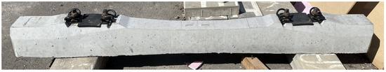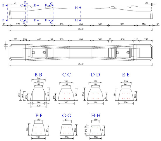 In the experimental campaign, seven pre-tensioned sleepers were tested in the Laboratory of Civil Engineering of the University of Žilina. One of the specimens can be seen in Figure 2. The length of each specimen was 2600 mm. The cross-section of sleepers was variable with a minimal height of 175 mm in the middle area and the maximal height was 234 mm. The minimal width of the cross-section at the bottom edge was 220 mm, while the maximal value was 300 mm. The upper edge of the sleepers was wide, ranging from 145.9 mm to 171 mm. Additional dimensions and the reinforcement layout of tested prestressed concrete sleeper type B70 W-49 G is shown in Figure 3. The producer declares that the specimens were made from concrete strength class C50/60 [36] and their weight was 288 kg. Prestressing was provided by overall eight prestressing wires with a diameter of 7 mm, whereas the surface of wires was smooth. At the time of testing, investigated specimens were one year old.