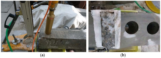 The experiment included the laboratory test of two cylinders with a diameter of 70 mm that were removed from the prestressed concrete sleeper, see Figure 4. For the removal of cylindrical samples from the sleeper, a core drill with an outer diameter of 78 mm was used. The height of the tested cylinder samples was 140 mm. Successful analysis of prestressing using saw-cut methods depends mainly on the correct determination of the concrete’s modulus of elasticity. Provided laboratory testing of the material properties of concrete provided the value of the secant modulus of elasticity and the cylindrical compressive strength. The mean cylindrical compressive strength fc,cyl was 63.3 MPa and the mean secant modulus of elasticity Ec was 37.4 GPa. Obtained results from material properties testing are presented in Table 1. Parenthetically, when using the saw-cut method, the values of the compressive strength of concrete are not strictly required as they do not affect the local stress change in the area adjacent to the performed saw-cuts. In the material properties testing, linear foil strain gauges HBM LY41-50/120 made of ferritic steel (temperature matching code “1”: 10.8 × 10−6/K) with a measuring grid length of 50.0 mm and a total length of 63.6 mm were installed on the samples.