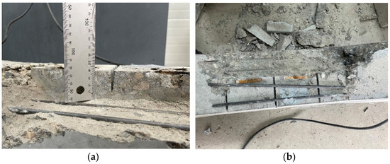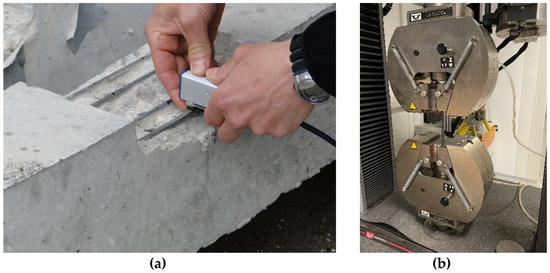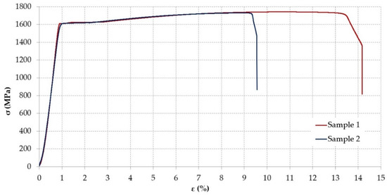 Determination of the prestressing wires’ properties was performed as part of the experimental program, too. After the application of saw-cuts, prestressing wires were exposed and then two samples were removed from the prestressed concrete sleeper for material testing, see Figure 5. Eventually, based on the laboratory tensile test, the mean measured tensile strength of the prestressing wires fp was 1736 MPa and the mean 0.1% proof-stress fp0.1 was 1547 MPa. Obtained properties are listed in Table 2. The evaluation test procedure according to ISO 6892-1:2019 [38] was performed using the Instron Universal Testing Machine with a testing capacity up to 200 kN. The test rates and control were set according to “Method A” recommended ranges. The diameter of the prestressing wire with a smooth surface was 7 mm, so its cross-sectional area Ap was 38.5 mm2. The stress–strain curve of the tested samples of prestressing wires is shown in Figure 6.