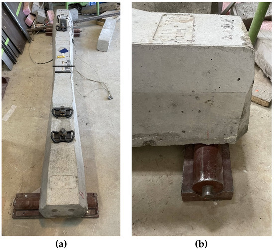 Supported prestressed concrete sleeper during the experiment (a) view, (b) detail.