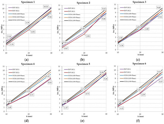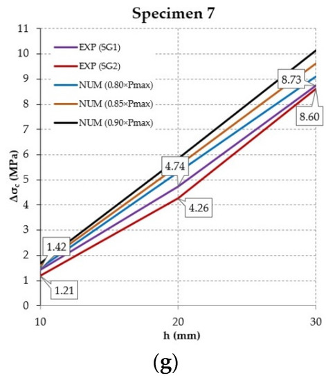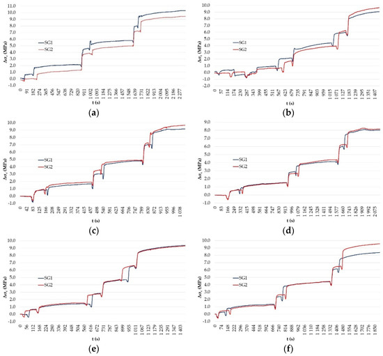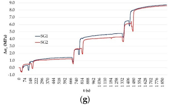 Recorded stress readings from testing of all seven specimens are presented in Figure 11. Evaluation of obtained results was based on the real value of the concrete’s modulus of elasticity determined via removed cylindrical samples in the experimental program.