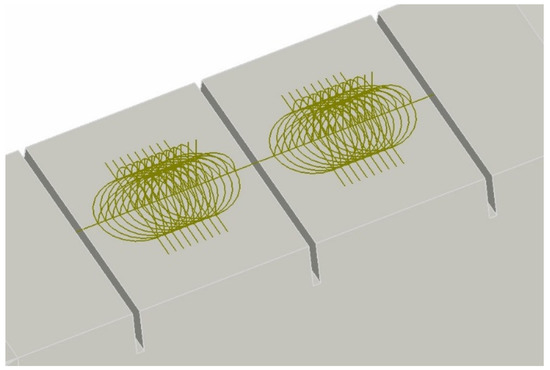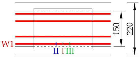 The location of stress monitoring points, which can be seen in Figure 19, was adopted according to the real position of strain gauges in the experiment. In the 3D model, each strain gauge was represented by nine monitoring points at a distance of 5 mm from each other. Finally, the stress change was determined as the average of the values obtained at the individual monitoring points over a length of 50 mm, which was chosen to express the measuring grid length of the strain gauges.