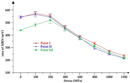 The Barkhausen noise investigation was carried out on one upper prestressing wire from Specimen 4. The scheme of the test is displayed in Figure 12. The experiment consisted of MBN measurement of the prestressing wire in the prestressed concrete sleeper at three points (Points I-III), removing of the wire, and subsequent calibration measurement in the laboratory under predefined loads (tensile stresses: 0; 100; 200; 400; 600; 800; 1000; and 1200 MPa). Finally, the obtained MBN signals were compared with signals measured on the specimen. For the measurement, the RollScan 350 (Stresstech, Jyväskylä, Finland) was used. The analysis was carried out with the MicroScan 600 Software with the following parameters: magnetising voltage, 5 V; magnetising frequency, 125 Hz; sensor type, S1-18-12-01; frequency range of magnetic Barkhausen noise pulses in the range of 10–1000 kHz. The signals were obtained by averaging 10 MBN bursts. Magnetic Barkhausen noise refers to the root mean square effective (RMS) value of the signal [16,17,39]. Performance of the MBN measurement can be seen in Figure 13, whereas obtained results are presented in Figure 14. The investigation provided the following detected values of rms of MBN (mV): 270.44 ± 14.0 (Point I); 255.51 ± 15.0 (Point II); and 287.76 ± 15.5 (Point III).