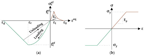 Uniaxial stress–strain curve for concrete (a); stress–strain curve for wires (b) [40].