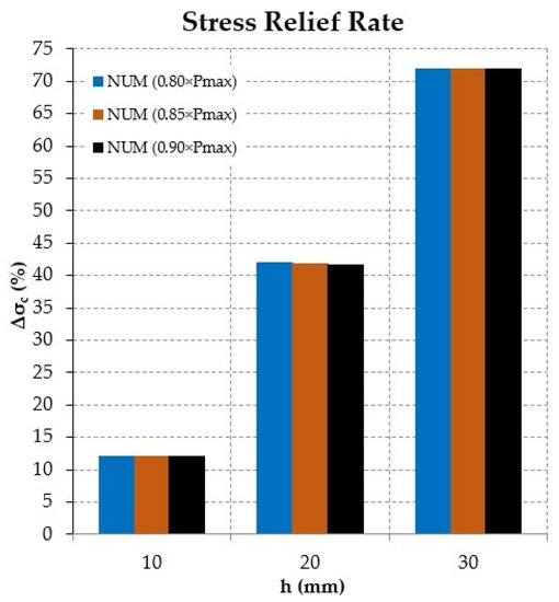 The standard value of prestressing force determined in compliance with the Eurocodes [43,44,45] after 365 days in one wire was 45.5 kN, whereas the overall residual prestressing force in the prestressed concrete sleeper (Pmt,theoretical) was 364.1 kN. The expected value of prestress losses in one wire was 7.9 kN and the total value (ΔPmt,theoretical) in all eight wires was 63.5 kN. Consequently, in a period of 365 days, the maximal prestressing force was expected to be decreased by 14.8%. Comparisons of stress relief results from the experimental measurements and numerical analysis are displayed in Figure 20. In this figure, stress relief curves from the numerical analysis (for prestress losses of 10, 15, and 20%) are compared to the experimentally measured values. As can be seen in Figure 21, the initial stress value does not influence the percentage stress relief rate. The example of stress change from numerical analysis for a specimen with expected prestress losses of 15% is presented in Figure 22. Obtained results from the numerical and experimental analyses suggest that percentage stress relief should not be influenced by the type of prestressed concrete member. A similar experiment was performed on post-tensioned beam and stress [23,24]. Therefore, local stress change monitored in the area adjacent to performed saw-cuts should be universal.