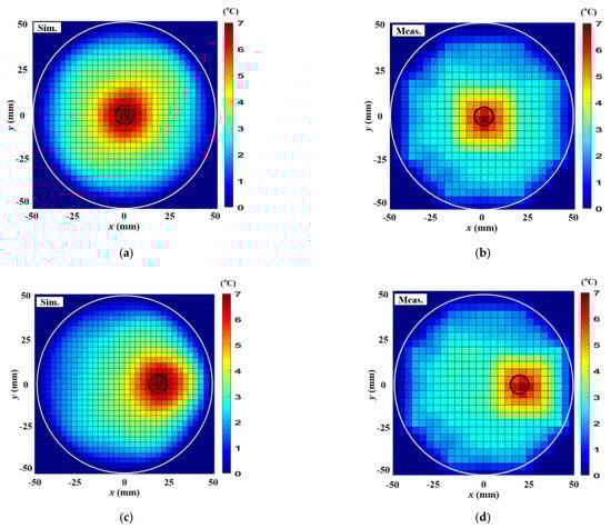 To verify the thermal effects, the temperature measurement setup and block diagram of the temperature measuring system are presented in Figure 11a,b, respectively. At the boundaries of the phantom in simulation, the initial temperature was set to 0C for a clear comparison of the measured temperature increase. The thermal experiments consisted of four stages of radio frequency (RF) signal generation and amplification, RF energy excitation, an experiment on the fabricated phantom, an experiment on the thermal effect, and an evaluation of the effects of the temperature rise [19]. The thermal effects on tumor necrosis were verified by analyzing the effective treatment area (ETA) [8], which was regarded as a region in which the tumor satisfies the temperature increase requirement of 7–10 .