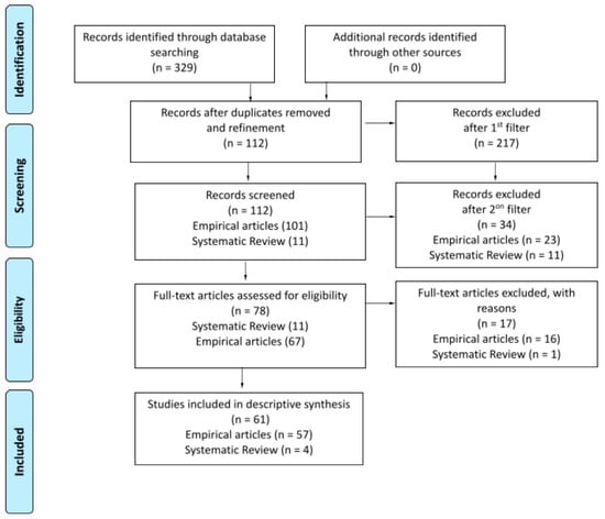 This search yielded 329 articles in two databases. After refinement involving document type, language, and research areas (Table 2), 112 articles passed the first screening. Based on the inclusion/exclusion criteria, we excluded 34 documents (23 empirical articles and 11 systematic reviews) with the second filter. Out of a total of 78 documents that were eligible to be read in full, 17 documents (16 empirical articles and 1 systematic review) were excluded after reading the full text for various reasons (13 studies could not be retrieved, 1 was written in a language other than English, 1 chapter, 1 collection of short, popular articles, 1 repeated). The total number of documents included in our review for analysis was 61 (57 empirical articles and 4 systematic reviews) (see Figure 1). Of all the papers analyzed, 22 were indexed in JCR (Q1 = 5; Q2 = 5; Q3 = 8; Q4 =4), one in SJR (Q3), and 32 were published in proceedings.