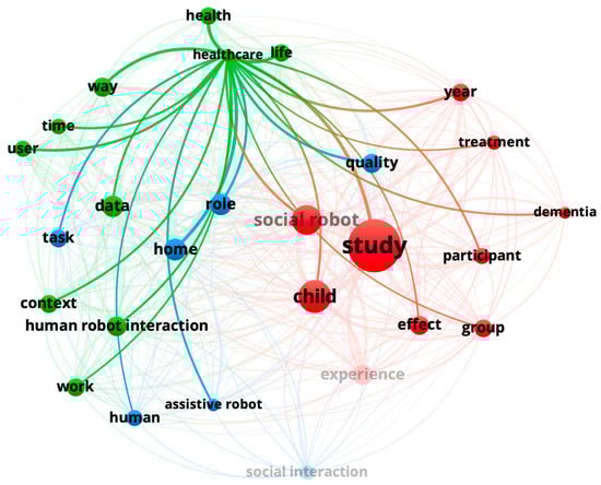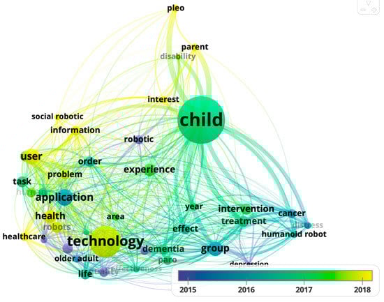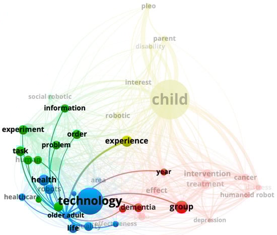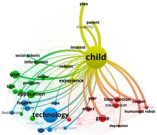 An analysis of the 3198 terms (titles + abstracts) revealed the evolution in time using full counting, with the restriction of a minimum of 10 occurrences per term. Sixty-nine met the threshold. The 60% most relevant terms are shown in Figure 2, a total of 41 terms. For instance, social robotic, information and healthcare appear as terms used more since 2018, Figure 3. A detailed view of the Children cluster allows us to identify specific social robots (i.e., Pleo) and applications in some diseases (i.e., cancer and depression). The same process was used to find another user profile (older adult) (Figure 4). In Figure 5, a binary count was carried out with a total of 323 links and 3 main clusters, one of them being healthcare context. This figure shows the main connections (social robot with study, human robot interaction and assistive robot) as different ways to address healthcare environments from an engineering perspective. Figure 6 also reveals that design and interaction are key topics in defining the areas of expertise of social robots and that the selection of papers can help us answer our research questions.