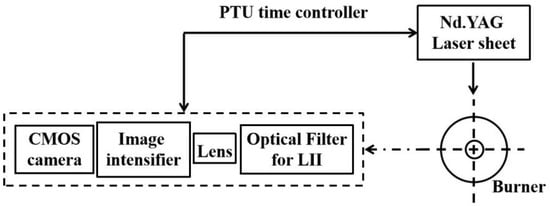 The LII theory was briefly introduced. The proper sheet laser source irradiated the flame; then, the soot inside the flame was heated to incandescence. The incandescence signal was captured by the CMOS camera through the image intensifier. The intensities at each point were marked as a count number range from 0 to 4095. The interval count value was determined by the camera. The soot volume fraction contour was represented by different count values.