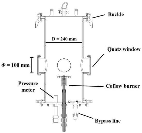 A stainless-steel pressure chamber controlled by a pump and a PLC (Programmable Logic Controller) system was employed. The working pressure ranged from 30 kPa to 101 kPa. Figure 2 shows the schematic of the pressure chamber from the front. The inner diameter and the inner height of the chamber were 240 mm and 600 mm, respectively. There were three observation ports with the diameter of 100 mm at the 0°, 90° and 180° locations. The 0° and 180° ports were used for the LII measurements while the 90° port was used for image-taking.