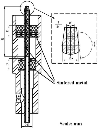 A coflow burner was mounted in the middle of the chamber 170 mm above the chamber floor. A 3-mm capillary stainless-steel pipe was used to supply the fuel. The coaxial coflow air inlet had a diameter of 25 mm. Both the fuel and air inlet tubes were filled with sintered copper to stabilize the flow and create a top hat exit velocity profile. The fuel nozzle was tapered to stabilize the flow around the nozzle [19]. The detailed draft of the coflow burner is shown in Figure 3.