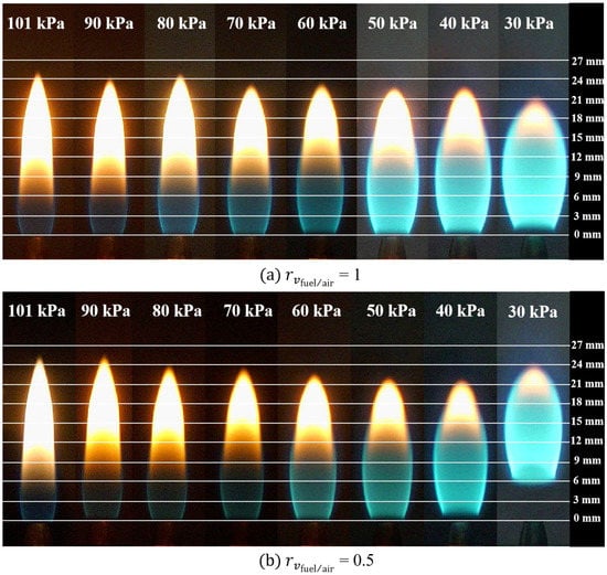 Pictures of coflow laminar diffusion flames from 101 kPa to 30 kPa. Propane flow rate was constant at 0.93 m/s; (a) ; (b) .