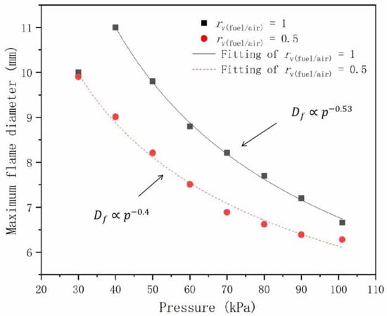 Power law fit for the maximum flame’s cross-section diameter (, ambient pressure = 30–101 kPa).