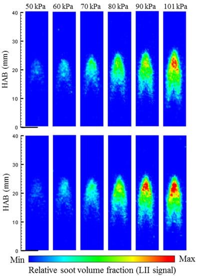 The LII signals obtained at pressures ranging from 50 kPa to 101 kPa are shown in Figure 6. Note that the flames at pressures lower than 50 kPa were not measured for the LII signal as it becomes too weak to be distinguished from the noise signal at very low pressures. Given that the intensity of LII signal is proportional to the soot volume fraction, the contour of the relative soot volume fraction () could be obtained, as in Figure 6. The contour of showed the general tendency that the soot yield increased and the sooting region moved upstream as the pressure increased. These tendencies coincide with the observations from Figure 4.