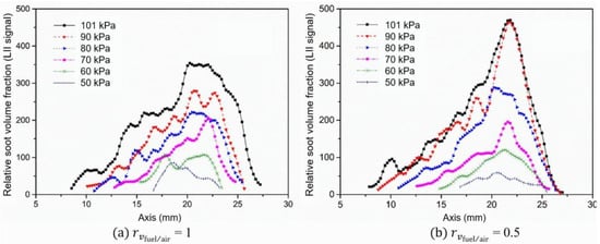 - The relative soot volume fraction represented by the LII signal intensity () decreases at lower pressures. However, at a lower air-to-fuel ratio, the soot volume fraction decreases more quickly with the decrease in pressure.