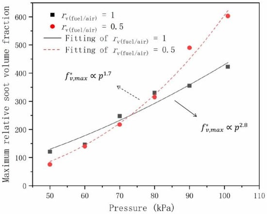 - The maximum relative soot volume fraction and the maximum relative soot mass flow rate have a power law relationships with pressure. The exponents were 1.7 and 2.8 for and 3.4 and 3.7 for , with and 0.5, respectively.