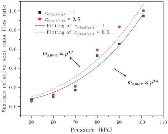 Power law fit of the maximum relative soot mass flow rate and pressure.