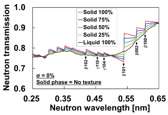 Prior to the solid–liquid phase fraction analysis of the measured spectra, the validity of the aforementioned analysis procedure was confirmed by simulated LBE Bragg-edge transmission spectra prepared using computer simulation shown below. The simulated total cross-section spectrum of the LBE solid phase was calculated using the RITS code [6] with the systematic variation of the texture information. The parameters considered here were the direction of the crystal orientation vector (preferred orientation <hkl>) and the degree of development of the orientation texture (March–Dollase coefficient, MD). However, since the ratio of the β-phase is higher than that of the γ-phase in LBE [20], only the texture of the β-phase was considered here. Sixteen types of texture combinations were created between four types of preferred orientation vectors (β<100>, β<002>, β<101>, β<102>) parallel to the neutron transmission direction and four types of MD coefficients (MD = 0.6, 0.7, 0.8, 0.9). A completely isotropic solid-phase texture (MD = 1.0) was added and we prepared 17 types of LBE solid-phase spectra in total. The total cross-section spectrum of the LBE liquid phase was prepared from the neutron transmission spectroscopic imaging experiment (see Section 4.2). The simulated transmission spectra of various phase fractions of the LBE mixed solid–liquid phase were calculated from these cross-sections according to the next equation: