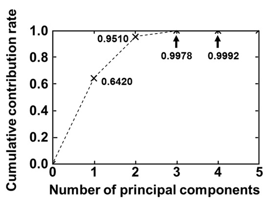 Figure 3 shows the result of the cumulative contribution evaluation of the transmission spectrum dataset with σ = 0% created in Section 3.1 to evaluate the amount of information lost due to the dimensionality reduction of PCA. The horizontal axis of the figure is the number of principal components after dimensionality reduction by PCA, while the vertical axis is the cumulative contribution rate explained in Section 2.2. From the cumulative contribution rate, it is evident that more than 99% of the original data can be expressed with the first three principal components of the PCA; namely, this dataset can be expected to be sufficiently analyzed by reducing the number of dimensions to three.