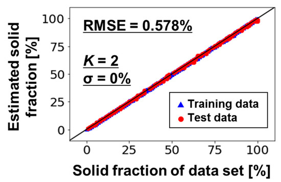 First, the result of the solid-phase fraction analysis by KNN is shown in Figure 5. In this case, the Gaussian distribution error was not added to the simulated spectrum dataset (σ = 0%). Here, K = 2 was used due to optimization. The horizontal axis of the diagram is the original solid-phase fraction, and the vertical axis is the solid-phase fraction estimated by KNN. The analyzed results of the test data shown by the red circle are in good agreement with the ideal values shown by the black line. In the figure, we also show the analysis results of the training data (blue triangles) in order to see how accurate the analysis can be when analyzing the data used for training. Although this depends on the type of ML algorithm used, if there is a difference between the training and test data distributions there is a possibility that overlearning is occurring. In this case, there appears to be no problem.