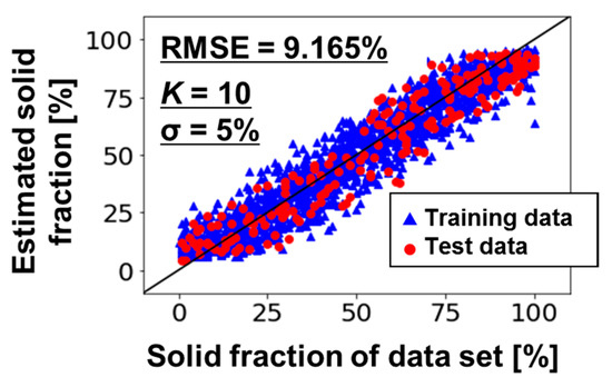 Next, we analyzed simulated datasets with Gaussian distribution errors (σ = 1, 2, 3, ..., 9, 10%) using the ML models built by the training spectra, including the errors, which is the subject of this research. For example, the ML analysis results for the dataset that included an error of σ = 5% were divided and analyzed as mentioned above and shown in Figure 6. Here, the hyperparameter K = 10 was the optimal value. As can be seen from the figure, the variance of both the training and test data groups increases around the black line, which is the set value of the solid-phase fraction. However, the estimated values follow the black line as a whole and the solid-phase fraction is considered to give results with a certain accuracy. Since the variances of the training and test data groups are about the same, note that our ML model did not fail with regard to overlearning.