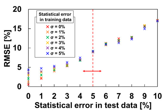 Figure 7 shows the difference in RMSE when the ML models were built from each dataset created by changing the simulated statistical error, σ. The horizontal axis of the diagram is the magnitude of the statistical error σ in the test data and the vertical axis is the RMSE. This figure shows the difference in RMSE depending on the statistical error (< 5%) of the training data. If the statistical error contained in the test data is small, it is more accurate to perform the analysis using an ML model built using the training data of small σ. However, looking at more than 5% of the horizontal axis shown in the diagram (statistical error of the test (analyzed) data), we found that the accuracy of the analysis was almost the same even when the statistical error of the test data was larger than the error in the training data. In other words, it is more profitable to obtain the training data with the same or better statistical accuracy than the analyzing data.