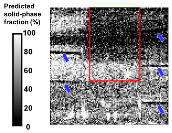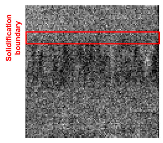 An example of solid–liquid phase fraction imaging (80 mm × 80 mm) results obtained by ML analysis (at the beginning of the solidification process). The black shadows at the blue arrow positions in the figure are the thermocouples in the sample. To eliminate the influence of the thermocouples and the insulation material around the sample container, the data inside the red frame were used for the analysis to determine the movement of the solid–liquid interface.