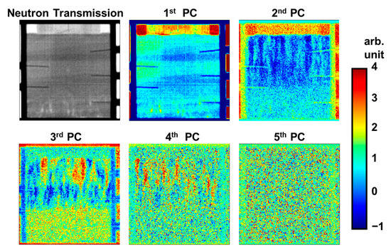 As an example of the PCA result of the LBE spectra in the solidified sample obtained in the experiment, the first through fifth principal components are shown with the neutron transmission image in Figure 11. Different images were obtained for each principal component. The first principal component closely resembles the neutron transmission image, while the images of the second through fourth principal components are images that emphasize the solidification texture. It can also be seen that the higher the principal component is, the more information is lost in the image. The image shows an almost uniform noise distribution in the fifth principal component. Although these images do not directly correspond to physical quantities, PCA can visualize points of interest in the shape of the neutron transmission spectrum. Note that the sample container and thermocouples are clearly visible in the lower-order principal components.