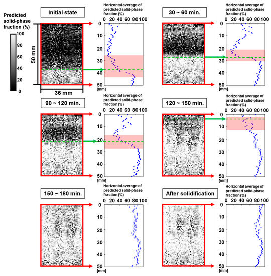 Some examples of the solid-phase fraction map and average in the horizontal direction inside the red-frame zone are shown in Figure 14. In the average diagram on the right in the figure, the horizontal axis is the solid-phase fraction and the vertical axis is the distance from the top of the sample. Initially, the lower zone of the image corresponds to 100% solid phase and the upper zone to 100% liquid phase. In the average diagram, the analyzed results of the solid- and liquid-phase zones do not show perfect 100% and 0% values, but this may be due to the influence of statistical errors and residual background components. However, as shown in the diagram, each zone shows moderately constant values and can be used to determine the solid- and liquid-phase zones. In addition, there is a zone of gradual change in phase fraction between these two zones, which is considered the zone where the solid–liquid interface moved within 30 min. This interfacial zone moves to the top over time, until eventually the whole area becomes solid.